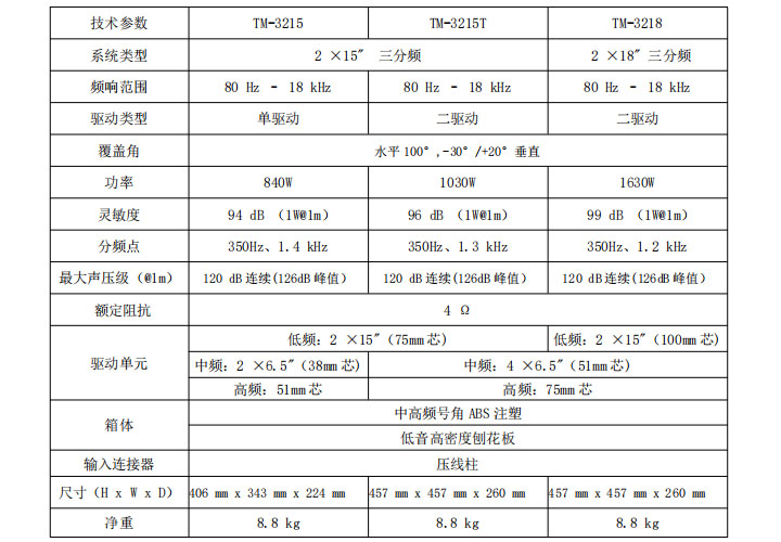 | 三分频设计可实现最大输出 还原最佳的人声 让声音更清晰更动听 今天的顶级电影院要求观众席的 每一个座位都有完美的覆盖范围更宽的动态范围和扩展的带宽, 以及主扬声器主要作用是完成电影中的对白声 中音高音号角均采用注钢塑模具生产,可提高声音的清晰度, 并且保证每个产品的质量如一,安装更便捷 可用于双功放操作(TM-3215T/TM-3218型) •获得国际专利的“6.5寸中音扬声器”设计, 更宽的动态范围可提高功率处理能力和减少变形。 •模压优化生产技术,实现超低失真和极低失真均匀频率响应 •SSC™屏幕扩展补偿 •聚焦覆盖技术 •最小屏后深度要求的浅剖面,仅400mm |